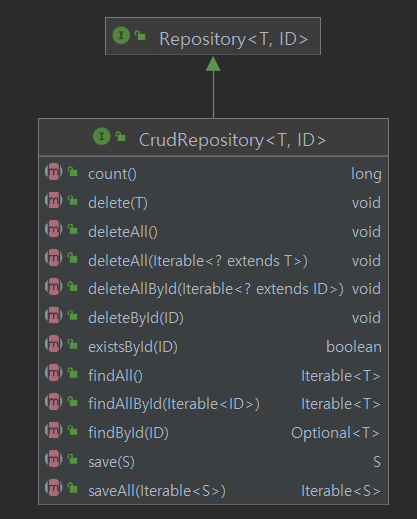 CrudRepository는 Repository를 상속하고 있고, 많이 사용되는 기본적인 메서드들이 선언되어 있다.